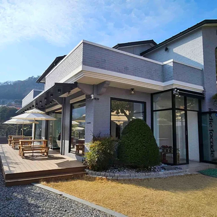 인디파사드는 목포의 근대역사관 바로 옆에 위치해 있어 관광을 즐기고 난 후에 방문하기 좋은 장소입니다. 카페의 외관은 현대적인 디자인을 갖추고 있으며, 넓은 마당과 다양한 식물들이 어우러져 있어 자연과 함께하는 느낌을 줍니다.