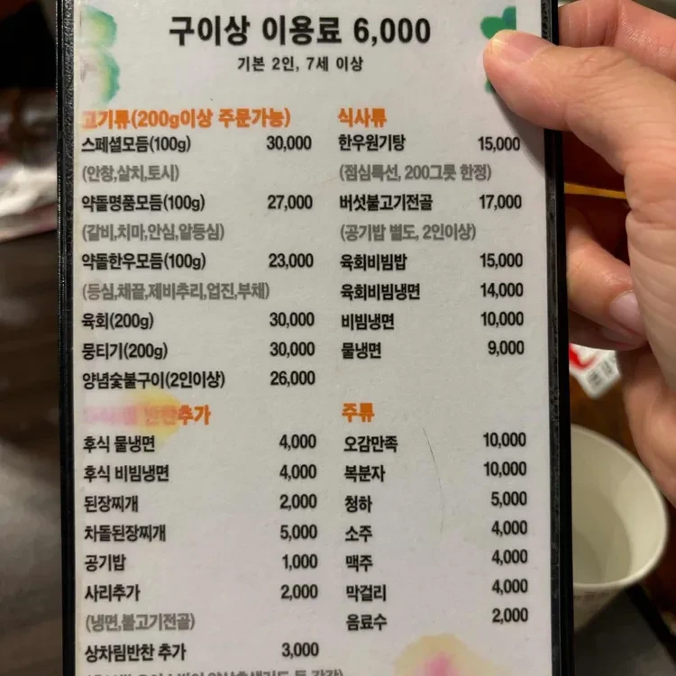 메뉴판을 보면, 구이류는 1인당 상차림비가 6,000원이 추가되며, 다양한 사이드 메뉴도 준비되어 있어요. 비빔밥, 국수 등도 함께 즐길 수 있어요.