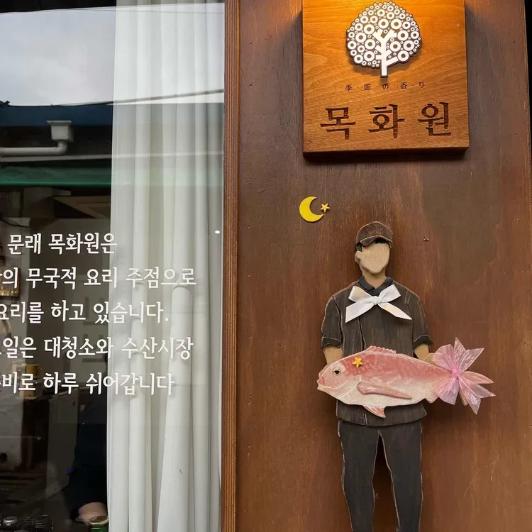목화원은 문래동의 중심가에 위치해 있어 접근성이 매우 좋아요. 식당의 외관은 나무로 된 간판과 함께 아기자기한 장식들이 눈에 띄는데, 특히 나무로 만든 큰 물고기를 들고 있는 인형이 인상적이에요. 이곳은 신선한 재료를 사용하여 요리를 제공하는 곳으로, 해산물의 신선함을 강조하고 있답니다.