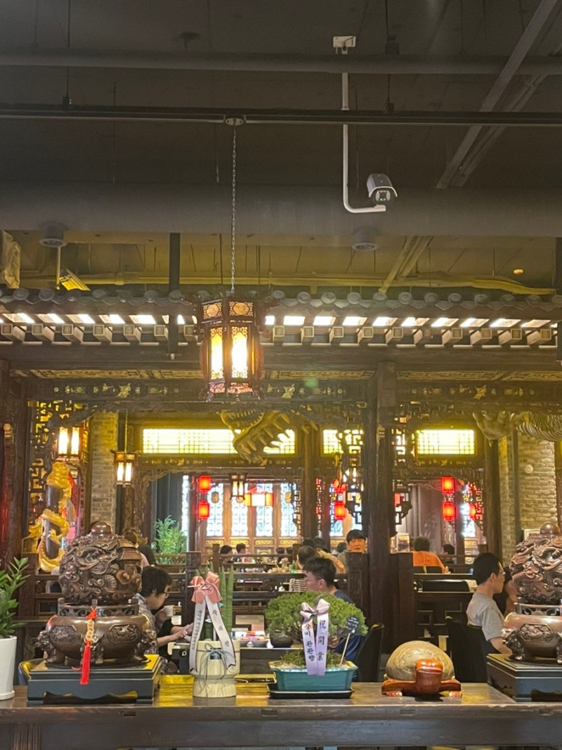 식당 내부는 전통적인 디자인으로 꾸며져 있어요. 나무 기둥과 화려한 장식들이 어우러져 아늑한 분위기를 만들어 주고 있어요.