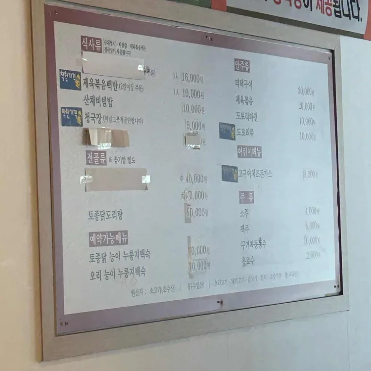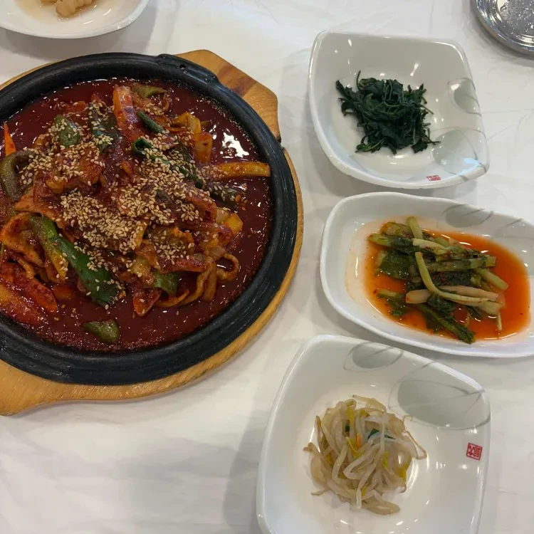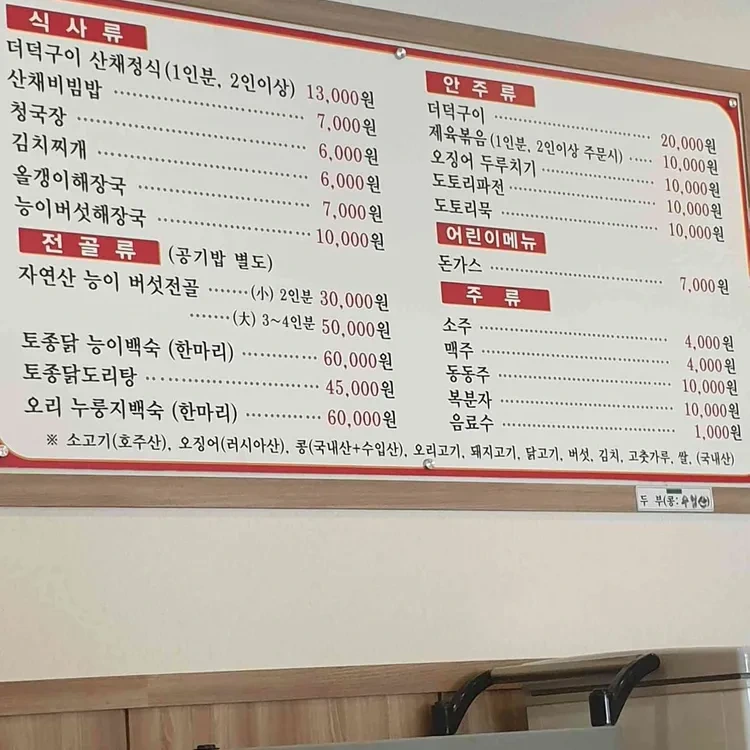 이곳의 메뉴는 정말 다양해요. 특히 추천하고 싶은 메뉴는 "더덕구이 산채정식"이에요. 가격은 13,000원으로, 신선한 더덕과 다양한 산채가 함께 나와서 건강한 한 끼를 즐길 수 있답니다. 또 다른 인기 메뉴인 "제육볶음"은 20,000원으로 매콤한 맛이 일품이에요. 아이들을 위한 메뉴도 준비되어 있어서 "돈가스"는 7,000원으로 저렴하게 제공된답니다.