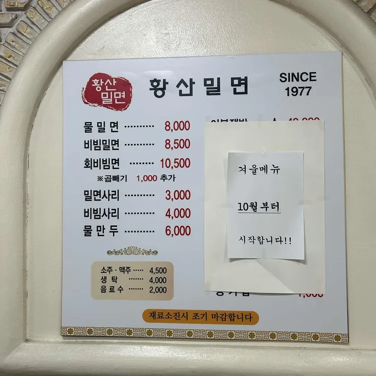 황산밀면의 메뉴는 다양하지만, 특히 추천하고 싶은 메뉴는 물밀면, 비빔밀면, 그리고 회비빔면이에요.