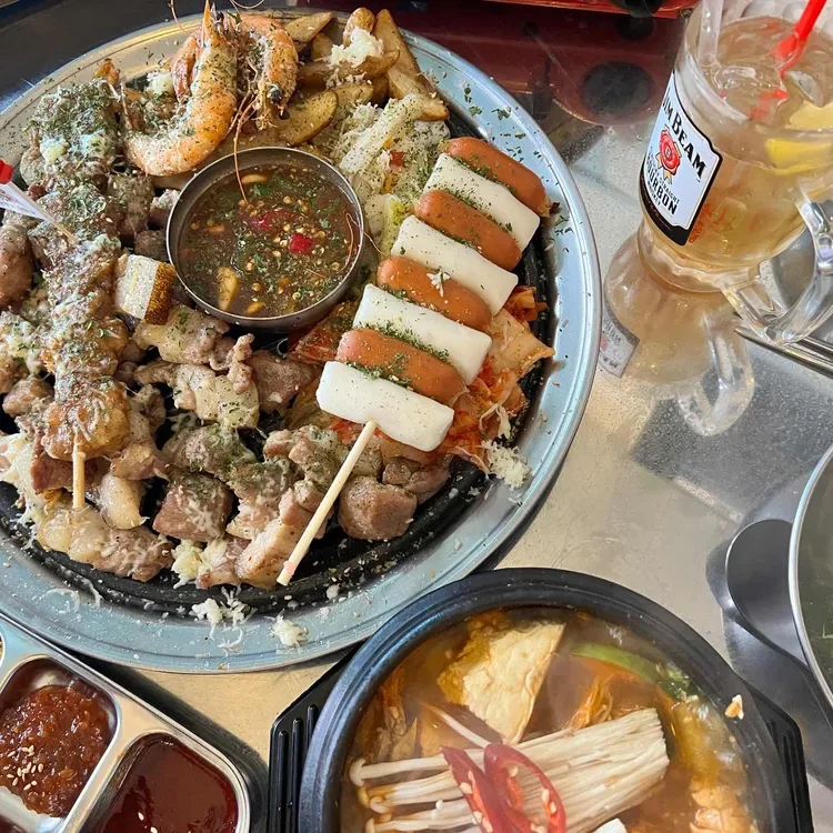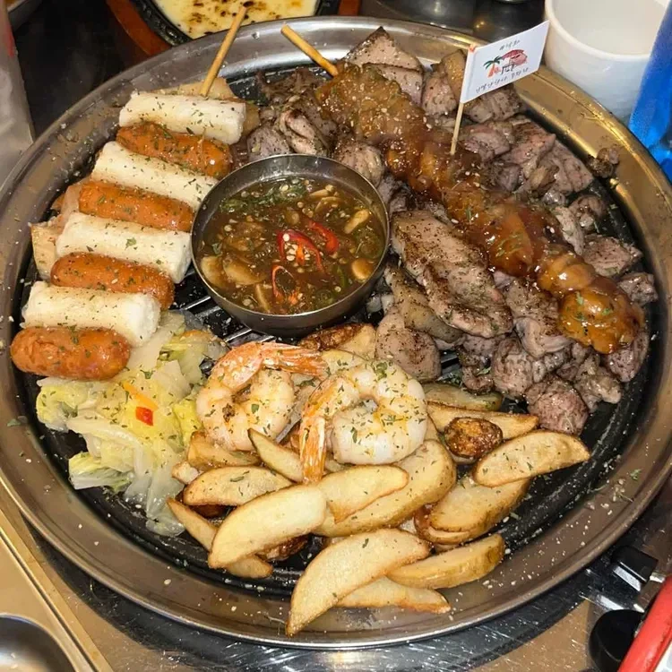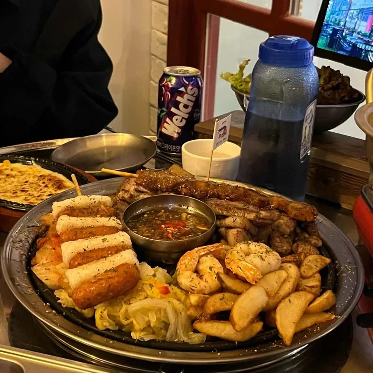 고기 외에도 해산물 메뉴도 인기가 많아요. 새우와 소시지, 그리고 감자튀김이 함께 나오는 플래터는 시각적으로도 매력적이고, 다양한 맛을 즐길 수 있어요.