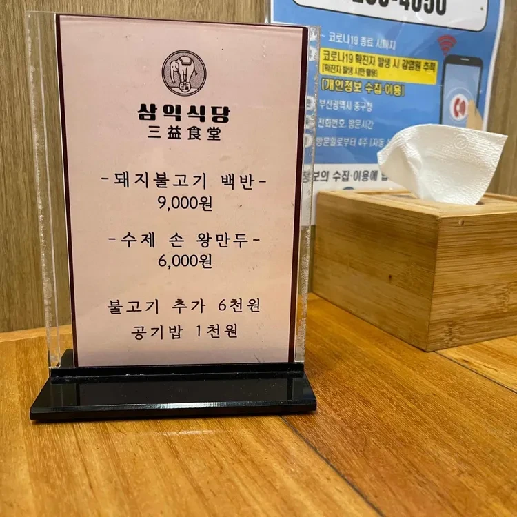 삼익식당의 주 메뉴는 불고기 백반이에요. 가격은 9,000원으로, 이 가격에 이렇게 푸짐한 양과 맛을 제공하는 곳은 드물죠. 불고기 외에도 수제 손 왕만두가 6,000원에 제공되는데, 만두피가 얇고 속이 꽉 차 있어 정말 맛있어요. 추가로 공기밥은 1,000원에 제공되니, 밥이 필요하신 분들은 꼭 추가해보세요!