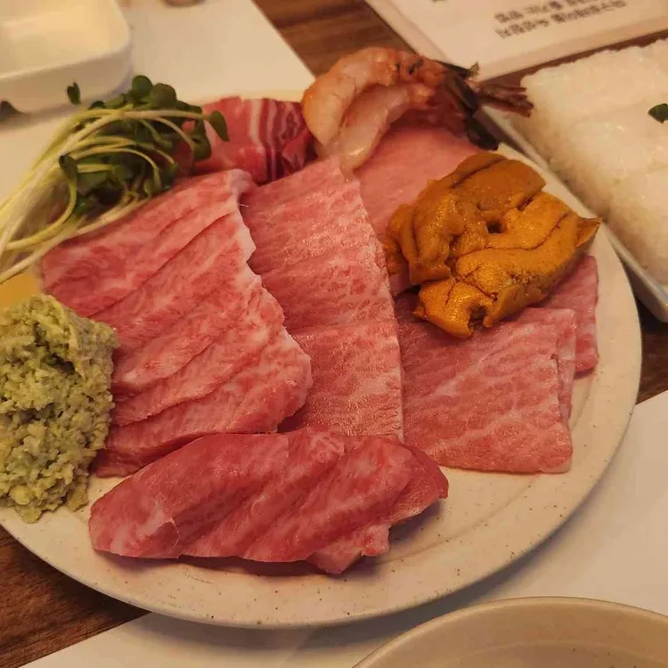 에서 보실 수 있듯이, 참치 위에 올려진 성게알과 와사비는 이곳의 특별한 조합이에요. 또한, 다양한 종류의 사시미도 제공되는데,