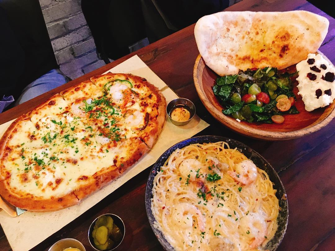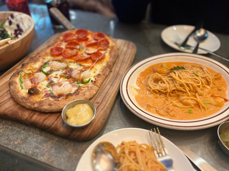 스톤스트리트의 메뉴는 다양해요. 특히 추천하고 싶은 메뉴는 크리미한 새우 파스타와 치즈가 듬뿍 올라간 피자예요.