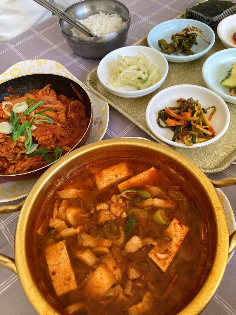 다양한 작은 접시들이 놓여져 있어, 한국의 전통적인 식사 문화를 느낄 수 있는 점이 매력적이에요.