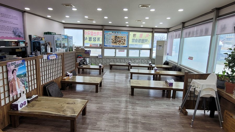 부안 백합식당의 내부는 아늑하고 편안한 분위기로 꾸며져 있어요. 전통적인 한국식 인테리어가 돋보이며, 자연광이 잘 들어오는 큰 창문이 있어 밝고 쾌적한 느낌을 줘요.