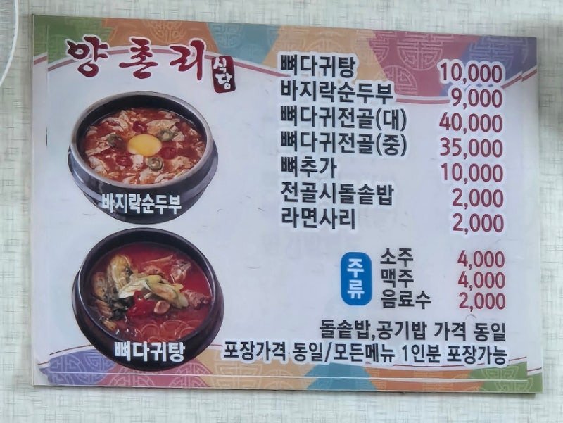 에서 보실 수 있는 것처럼, 바지락순두부는 9,000원, 빠다귀탕은 10,000원, 그리고 빠다귀전골은 35,000원에서 40,000원으로 제공되죠. 이 외에도 돌솥밥과 라면사리 등 다양한 사이드 메뉴도 있어요. 가격대비 양과 맛이 정말 훌륭해요.