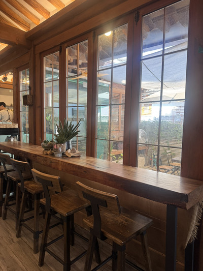 카페 내부는 따뜻한 나무톤으로 꾸며져 있어 아늑한 느낌을 줍니다. 큰 창문으로 들어오는 자연광이 공간을 밝게 비추고, 다양한 식물들이 인테리어에 생기를 더해주고 있어요.
