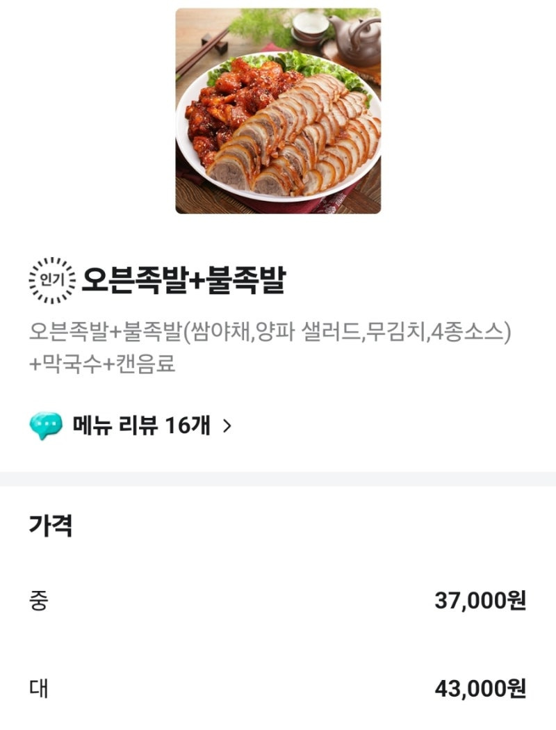 메뉴는 정말 다양해요. 대표적인 메뉴는 오븐 족발과 불족발이 있는데, 특히 반반 족발이 인기랍니다. 가격은 중 사이즈가 37,000원, 대 사이즈가 43,000원이에요.