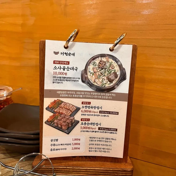순대는 다양한 종류가 있는데, 특히 소사골순대가 인기예요. 가격은 6,000원으로, 양도 푸짐하고 맛도 훌륭해요. 그리고 순대와 함께 나오는 다양한 반찬들도 맛있답니다.