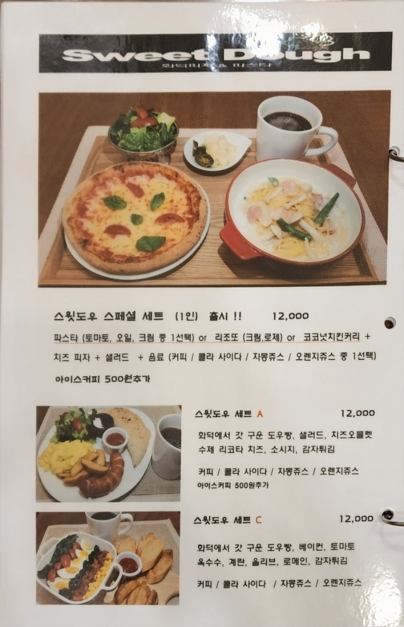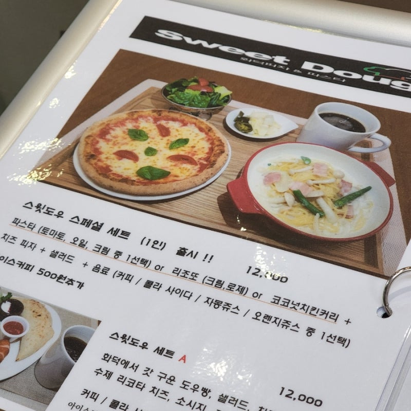 또한, 스윗도우의 스페셜 세트 메뉴도 놓치지 마세요! 세트 메뉴는 피자, 파스타, 샐러드, 커피가 포함되어 12,000원으로 가성비가 뛰어나요.