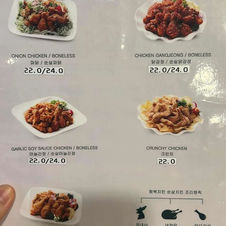 행복치킨의 메뉴는 다양해요. 특히 추천하고 싶은 메뉴는 '파닭'과 '마늘간장치킨'이에요. 파닭은 부드러운 닭고기와 아삭한 파가 어우러져 정말 맛있어요. 가격은 대략 22,000원에서 24,000원 사이로, 가성비도 뛰어나요.