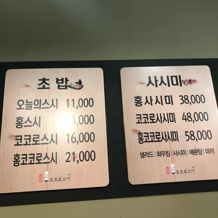 홍코코로스시의 메뉴는 다양하고 가격대도 합리적이에요. 초밥 메뉴는 "오늘의 스시"가 11,000원, "홍스시"가 14,000원, "코코로스시"가 16,000원, "홍코코로스시"는 21,000원이에요. 사시미 메뉴도 다양하게 준비되어 있는데, "홍사시미"는 38,000원, "코코로사시미"는 48,000원, "홍코코로사시미"는 58,000원으로 가격이 책정되어 있어요.