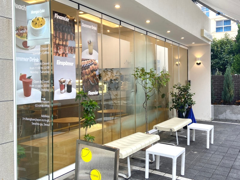 카페의 큰 유리창을 통해 내부가 보이는데, 항상 많은 사람들이 모여 있는 모습이 인상적이에요. 특히, 외부에 마련된 벤치와 작은 화분들이 아늑한 분위기를 더해주고 있어요.