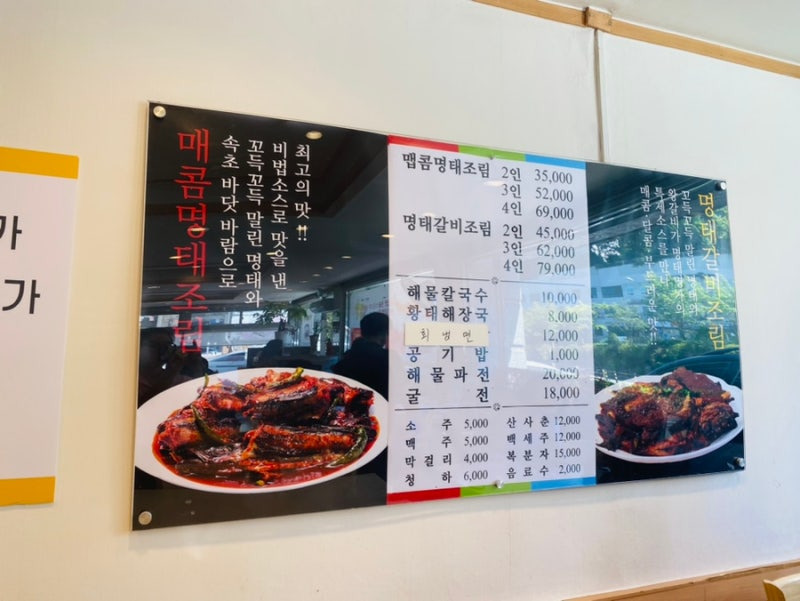 이곳의 대표 메뉴는 매콤명태조림이에요. 가격은 중자 기준으로 약 30,000원 정도로, 4명이 먹기에 적당한 양이에요. 매콤명태조림 외에도 명태갈비조림, 해물칼국수 등 다양한 메뉴가 있어요. 특히 해물칼국수는 국물이 진하고 해물의 풍미가 가득해 추천해요.