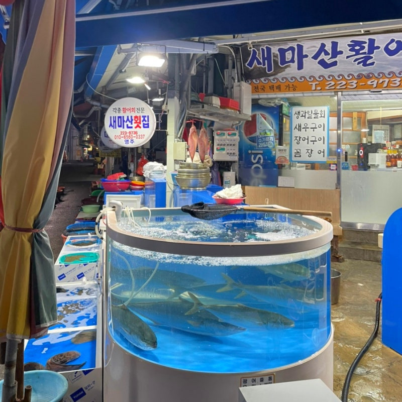 새마산활어횟집은 마산 어시장 근처에 위치해 있어요. 이곳은 신선한 해산물을 직접 구매할 수 있는 어시장과 가까워, 항상 신선한 재료를 사용하고 있다는 점이 큰 장점이에요. 식당 외관은 깔끔하고 현대적인 느낌을 주며, 입구에는 큰 수조가 있어 살아있는 물고기를 직접 볼 수 있어요. 이 모습은 손님들에게 신선함을 더욱 강조해 주는 것 같아요.