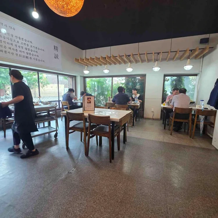 식당 내부는 현대적이면서도 아늑한 분위기를 자아내고 있어요. 나무 테이블과 의자가 잘 배치되어 있어 편안하게 앉을 수 있고, 큰 창문을 통해 들어오는 자연광이 공간을 밝게 만들어 줘요.