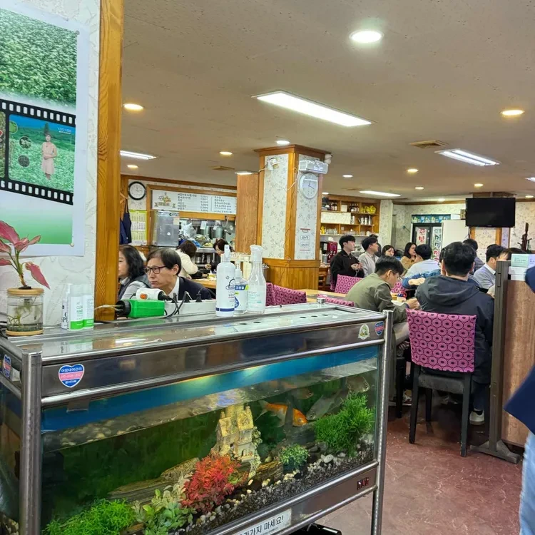 나무로 된 테이블과 의자, 그리고 따뜻한 조명이 어우러져 편안한 식사 시간을 제공합니다. 또한, 식당 한쪽에는 큰 수조가 있어 다양한 물고기를 볼 수 있어요. 이로 인해 아이들과 함께 방문하기에도 좋은 장소인 것 같아요.