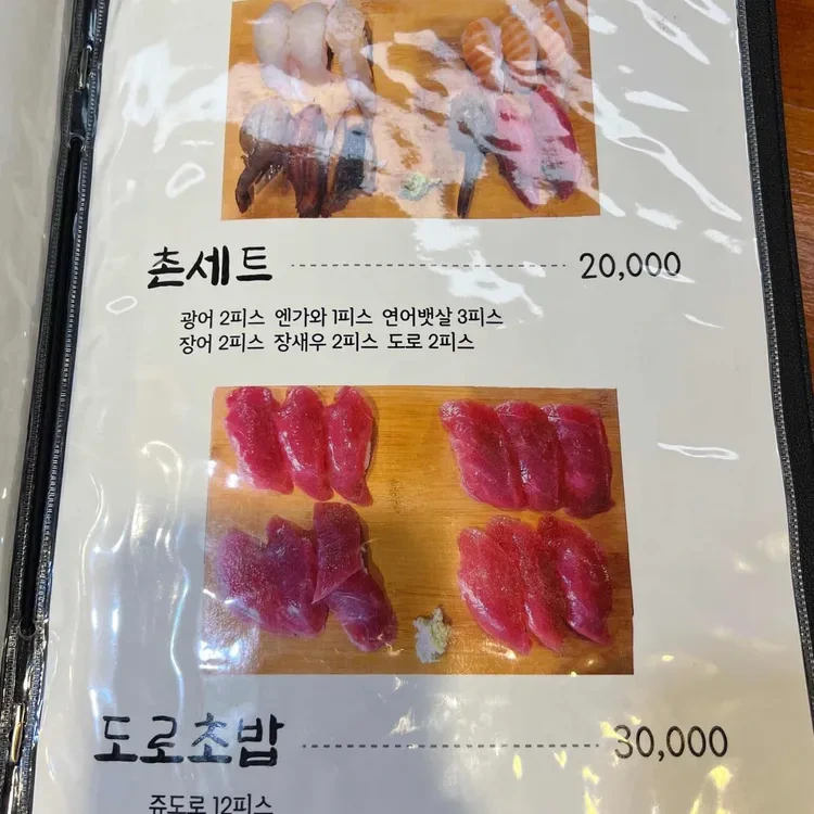 문화촌초밥집의 메뉴는 다양하고 가격대도 합리적이에요. 특히 추천하고 싶은 메뉴는 '초세트'와 '도로초밥'이에요. 초세트는 20,000원에 다양한 초밥을 맛볼 수 있는 구성으로, 2조각의 장어, 1조각의 오징어, 3조각의 연어, 2조각의 새우, 2조각의 참치가 포함되어 있어요. 도로초밥은 30,000원으로 12조각의 초밥이 제공되며, 다양한 생선이 포함되어 있어요. 가격 대비 양과 질이 뛰어나서 가성비가 좋답니다.