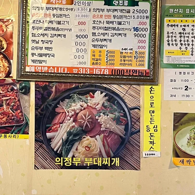 이곳의 대표 메뉴는 부대찌개와 돈까스예요. 부대찌개는 다양한 재료가 들어가서 국물이 진하고 맛있어요. 특히, 라면사리와 함께 먹으면 더욱 맛있답니다. 가격은 1인분 기준으로 약 8,000원 정도로, 양도 푸짐해서 가성비가 뛰어나요.
