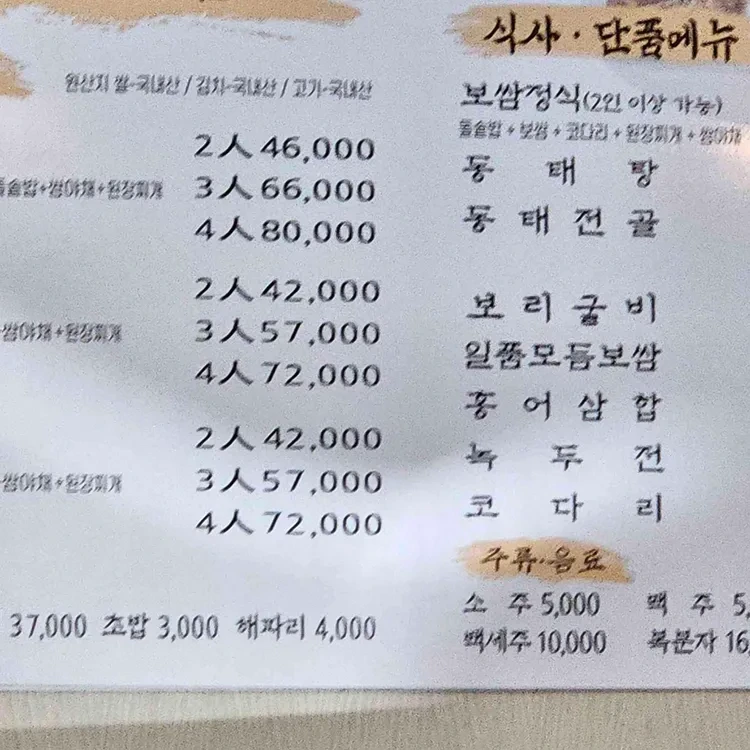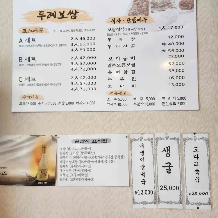 두레보쌈의 가격대는 매우 합리적이에요. 보쌈 정식은 42,000원부터 시작하며, 세트 메뉴는 80,000원까지 다양하게 구성되어 있어요.