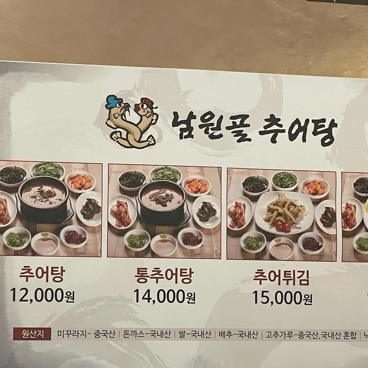 이곳의 대표 메뉴는 바로 '추어탕'이에요. 기본적인 '추어탕'은 12,000원, 좀 더 푸짐한 '통추어탕'은 14,000원, 그리고 바삭한 '추어튀김'은 15,000원이에요. 가격대가 적당하고, 각 메뉴에는 다양한 반찬이 함께 제공되어 더욱 풍성한 식사를 즐길 수 있어요.
