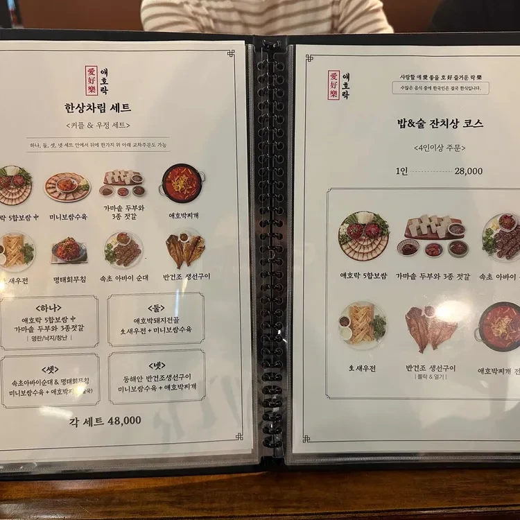 애호락의 메뉴는 다양하고 가격대도 합리적이에요. 대표적인 메뉴로는 보쌈, 애호박찌개, 그리고 다양한 전이 있어요. 가격은 보쌈 세트가 48,000원, 개인 메뉴인 'Bap & Sul Course'는 28,000원으로, 푸짐한 양에 비해 가격이 괜찮은 편이에요. 메뉴판을 보면
