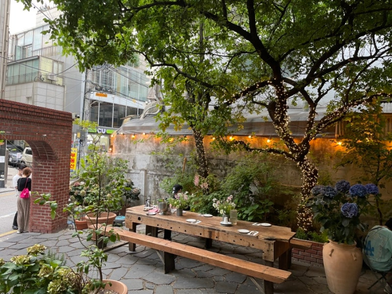 외부에는 아기자기한 테이블과 의자들이 놓여 있어, 친구들과 함께 앉아 수다를 떨기에도 좋은 장소야. 특히, 나무에 걸린 조명들이 저녁에 더욱 로맨틱한 분위기를 만들어줘.
