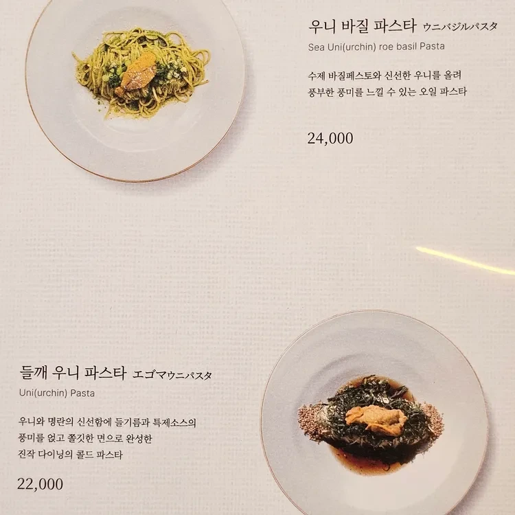 - Sea Uni (urchin) Roe Basil Pasta: 24,000원