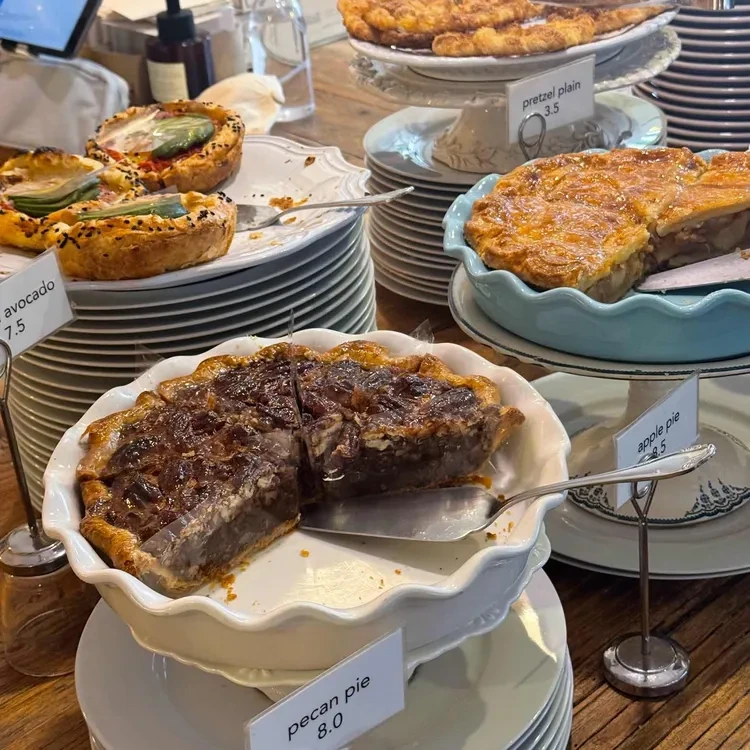 디저트 진열대에는 다양한 파이와 페이스트리가 진열되어 있어. 특히 pecan pie는 반쯤 잘린 모습으로 진열되어 있어서 눈길을 끌어. 가격은 8,000원이야.