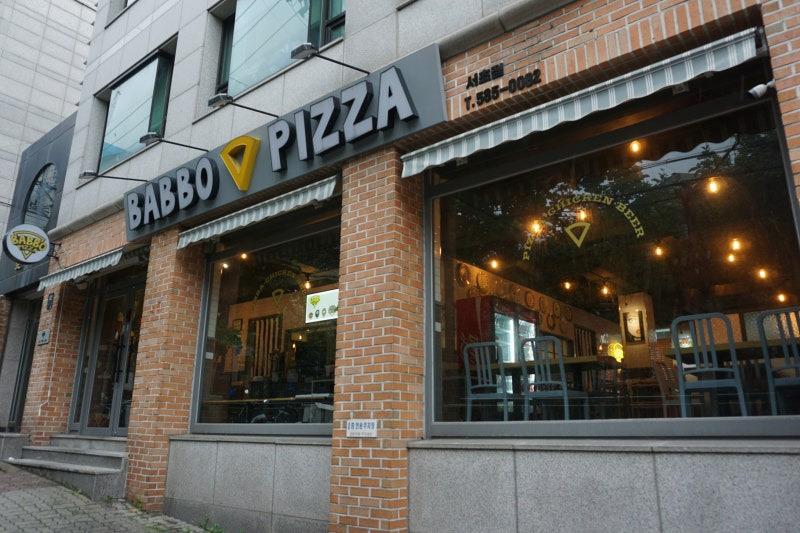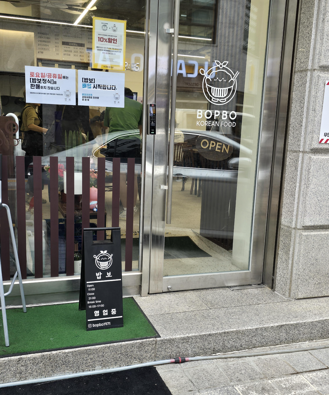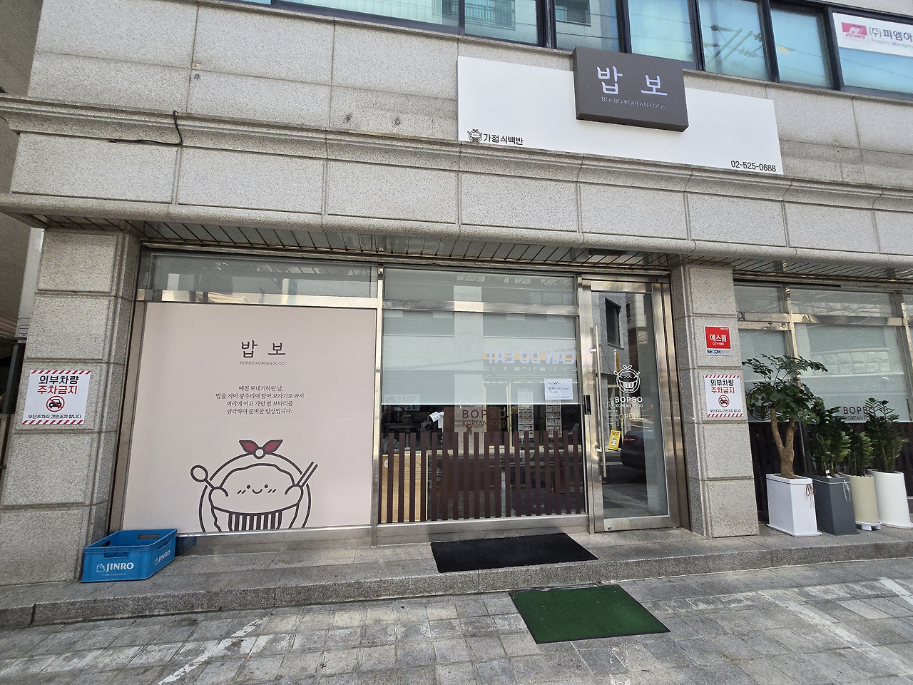 밥보는 서울 서초구 방배동에 위치해 있으며, 현대적인 건물의 1층에 자리 잡고 있어요. 외관은 깔끔하고 세련된 느낌을 주며, 입구에는 귀여운 캐릭터가 그려진 간판이 있어요.