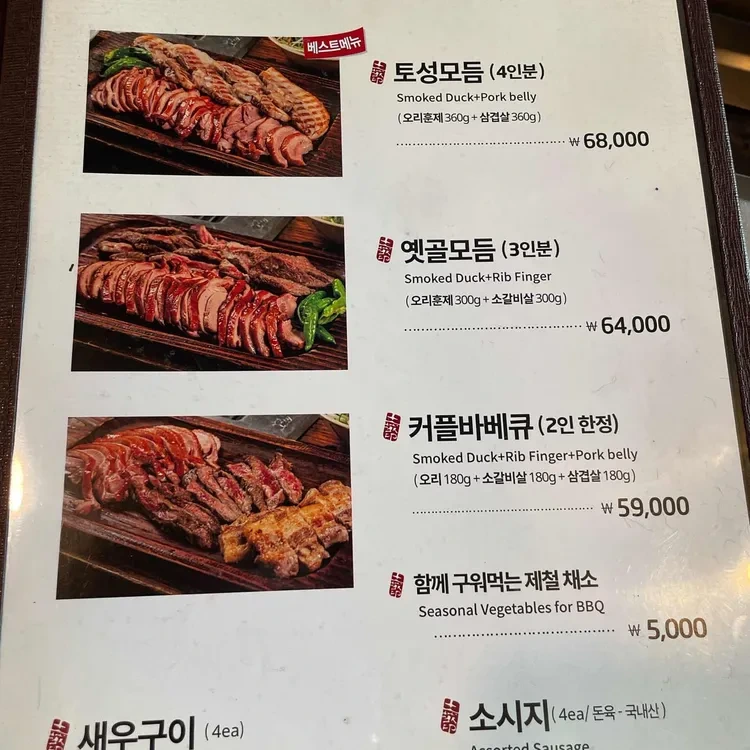 옛골토성의 메뉴는 주로 고기 요리로 구성되어 있어요. 특히, "토성모듬" (68,000원), "옛골모듬" (64,000원), "커플바베큐" (59,000원) 등 다양한 고기 조합이 있어요.