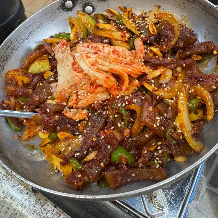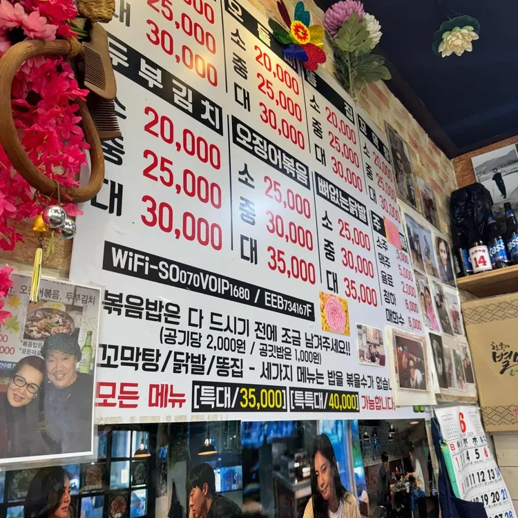 이곳의 대표 메뉴는 바로 돼지껍데기 볶음이에요. 쫀득쫀득한 식감과 매콤한 양념이 일품이죠. 가격은 20,000원에서 40,000원 사이로, 다양한 메뉴가 준비되어 있어요. 특히, 볶음밥과 오돌뼈, 오징어볶음도 인기 메뉴랍니다.