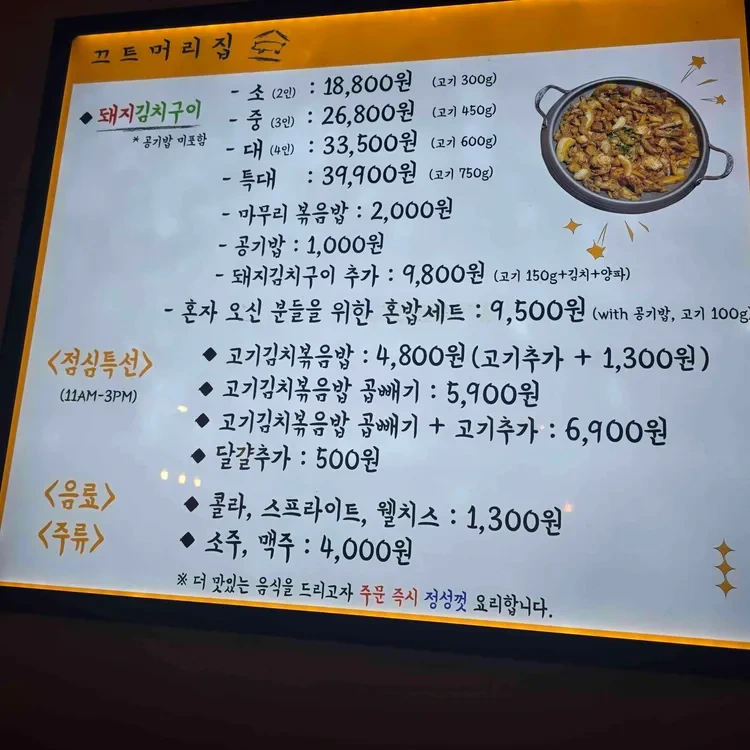 이곳의 대표 메뉴는 바로 돼지김치구이에요. 가격은 소 사이즈가 18,800원, 중 사이즈가 26,800원, 대 사이즈가 33,500원, 특대 사이즈가 39,900원이에요. 가격대가 적당해서 가성비가 좋다는 평이 많아요. 그리고 점심 특선으로는 고기김치볶음밥이 저렴하게 제공되니, 점심시간에 방문하면 더욱 좋을 것 같아요.