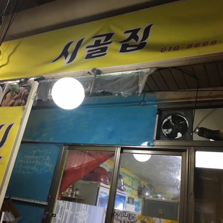 시골집은 성동구 뚝도시장 근처에 위치해 있어요. 외관은 밝은 노란색 간판이 눈에 띄고, 유리문으로 되어 있어 내부가 잘 보이죠.