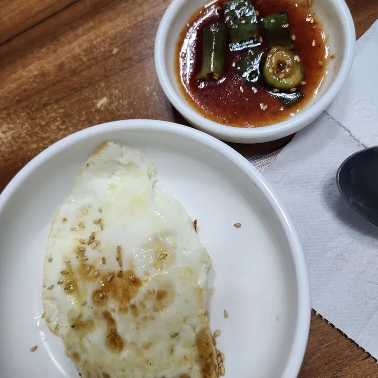 사이드 메뉴로는 김치, 계란 프라이, 그리고 매콤한 무생채가 있어요. 이 모든 것이 해장국과 잘 어울려서 더욱 맛있게 즐길 수 있답니다.