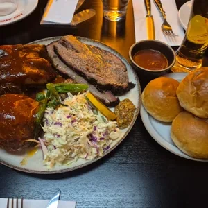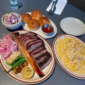 에서 보시는 것처럼, 훈제된 브리스킷과 립, 그리고 구운 고추와 함께 제공되는 콜슬로가 정말 맛있어요. 또 다른 추천 메뉴로는 '풀드 포크'와 '맥앤치즈'가 있어요. 풀드 포크는 부드럽고 풍미가 가득하며, 맥앤치즈는 크리미한 맛이 일품이에요. 가격은 각각 1만 원대 후반이에요.