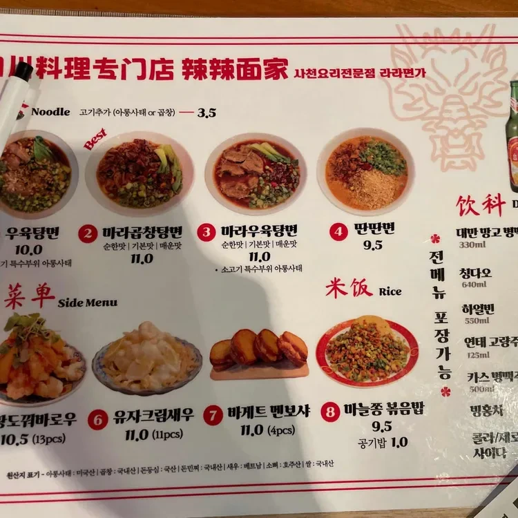 라라면가의 메뉴는 정말 다양해요. 대표적인 메뉴로는 우육탕면(10,000원), 미리공창탕면(11,000원), 마라우육탕면(11,000원) 등이 있어요. 사이드 메뉴로는 유자크림새우(11,000원)와 바게트 벤보사(11,000원)도 추천해요. 가격대는 적당하고, 양도 푸짐해서 만족스러웠어요.