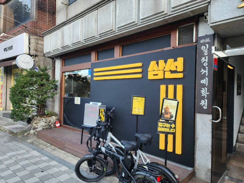 성북구에 위치한 중식당 삼선은 한성대입구역에서 도보로 약 5분 거리에 있습니다. 외관은 현대적이고 세련된 느낌을 주며, 어두운 벽에 노란 글씨로 '삼선'이라는 이름이 적혀 있어 눈에 띕니다. 주변에는 자전거가 주차되어 있고, 교육기관의 간판도 있어 활기찬 분위기를 자아냅니다.