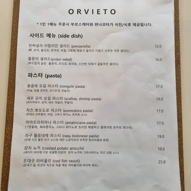 제가 오르비에토를 방문했을 때, 주말 저녁이었는데도 불구하고 예약 없이 방문했어요. 다행히 자리가 있었고, 직원들이 친절하게 안내해주셨어요. 첫 번째로 주문한 봉골레 파스타는 정말 맛있었고, 해산물의 신선함이 느껴졌어요. 그리고 디저트로 주문한 크림 페이스트리는 달콤하면서도 부드러워서 입안에서 사르르 녹았답니다.