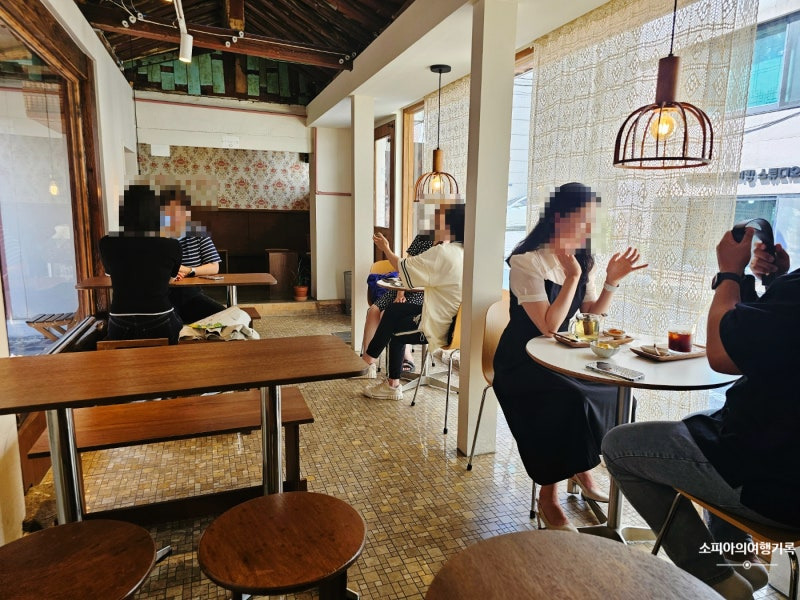 에서 보이는 입구는 고풍스러운 나무 패널과 전통 기와 지붕이 인상적이에요. 카페 내부는 자연광이 잘 들어와서 밝고 쾌적한 느낌을 주며,
