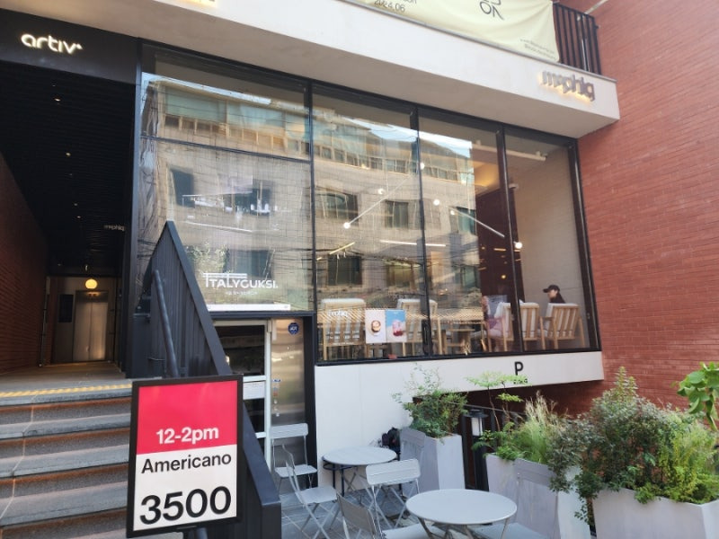 카페의 입구는 넓고 환하게 열려 있어, 지나가는 사람들도 자연스럽게 발길을 멈추게 만드는 매력이 있어요.