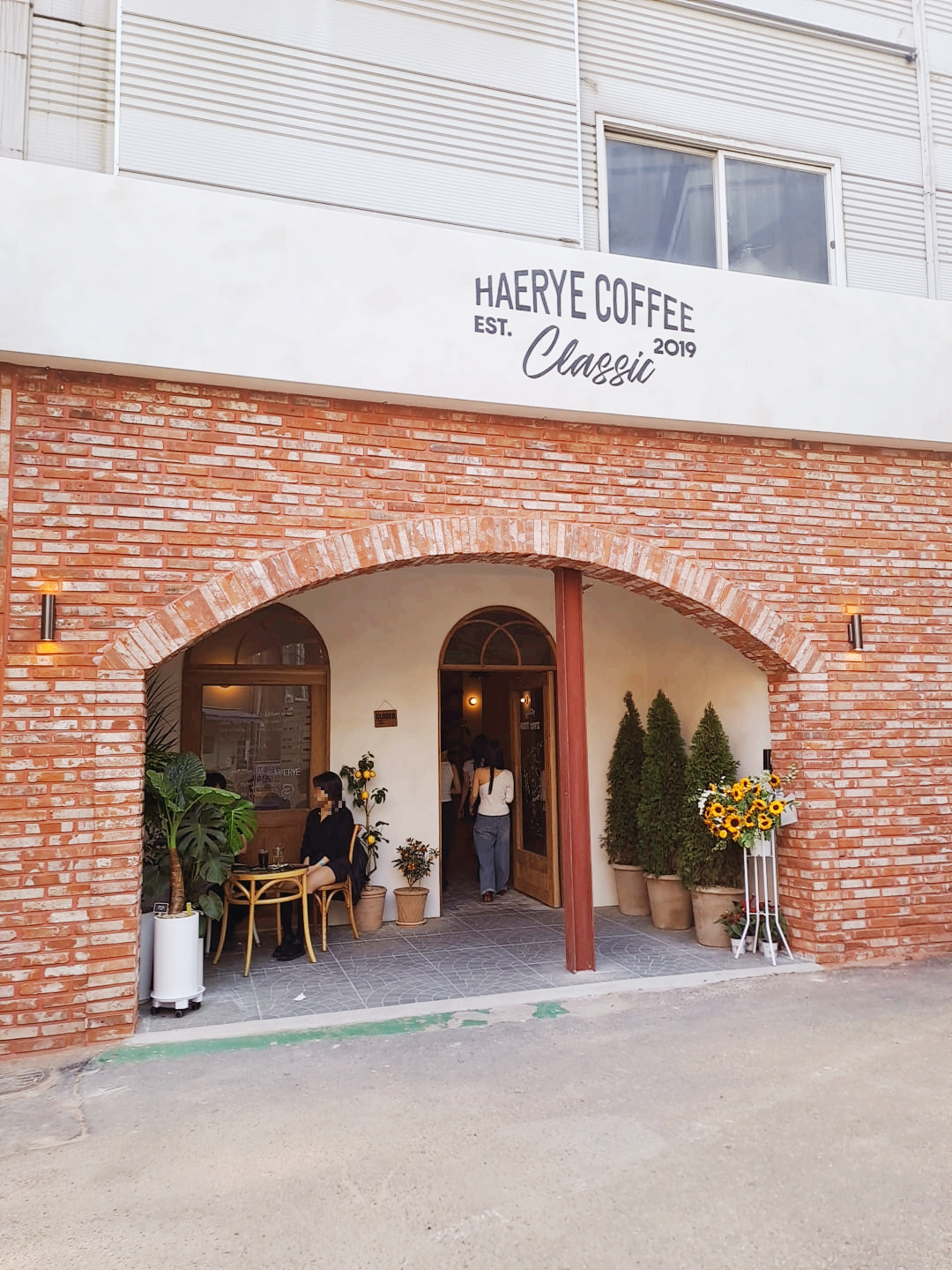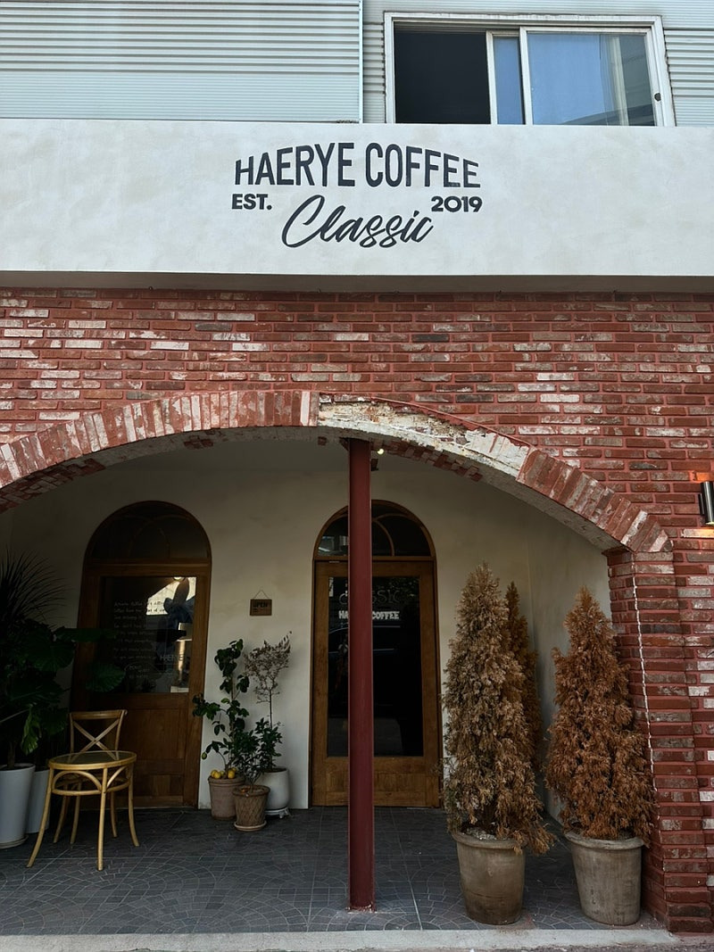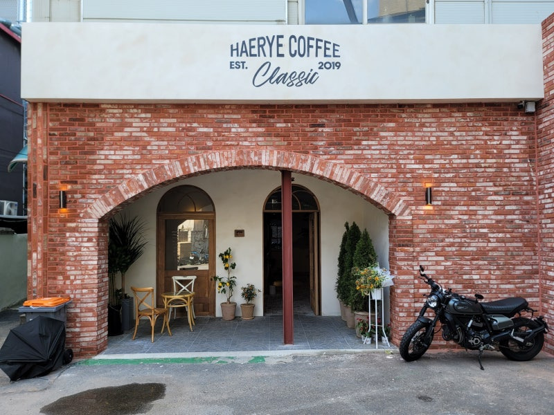 성수동에 위치한 해례커피는 2019년에 설립된 카페로, 그 매력적인 외관과 아늑한 분위기로 많은 사람들의 사랑을 받고 있어요. 이곳은 클래식한 느낌의 벽돌 외관과 아치형 입구가 인상적이며, 입구 양쪽에는 화분과 해바라기가 놓여 있어 따뜻한 환영을 받는 기분이 들어요.