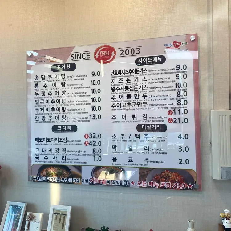이곳의 대표 메뉴는 송담추어탕이에요. 진한 국물과 신선한 미꾸라지가 어우러져 깊은 맛을 자랑해요. 가격은 9,000원에서 13,000원 사이로, 다양한 사이드 메뉴와 음료도 제공되는데, 소주는 2,000원, 음료수는 4,000원 정도에요.