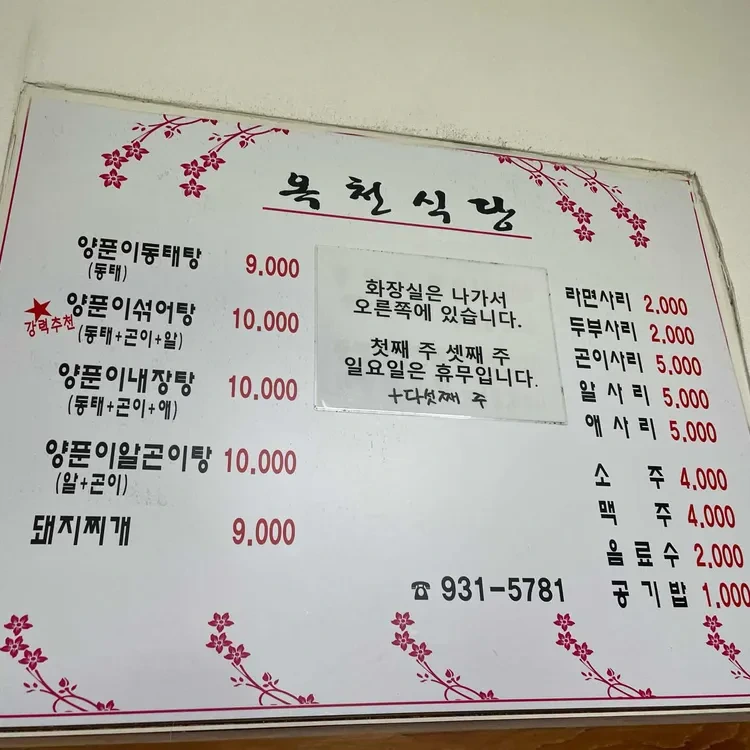 옥천식당의 대표 메뉴는 바로 양푼이 동태탕이에요. 이 메뉴는 신선한 동태와 다양한 채소가 어우러져 깊은 맛을 내는 국물 요리로, 특히 겨울철에 먹으면 정말 따뜻하고 좋답니다. 또 다른 추천 메뉴로는 돼지찌개가 있어요. 이 찌개는 푸짐한 양과 깊은 맛으로 많은 사랑을 받고 있어요.