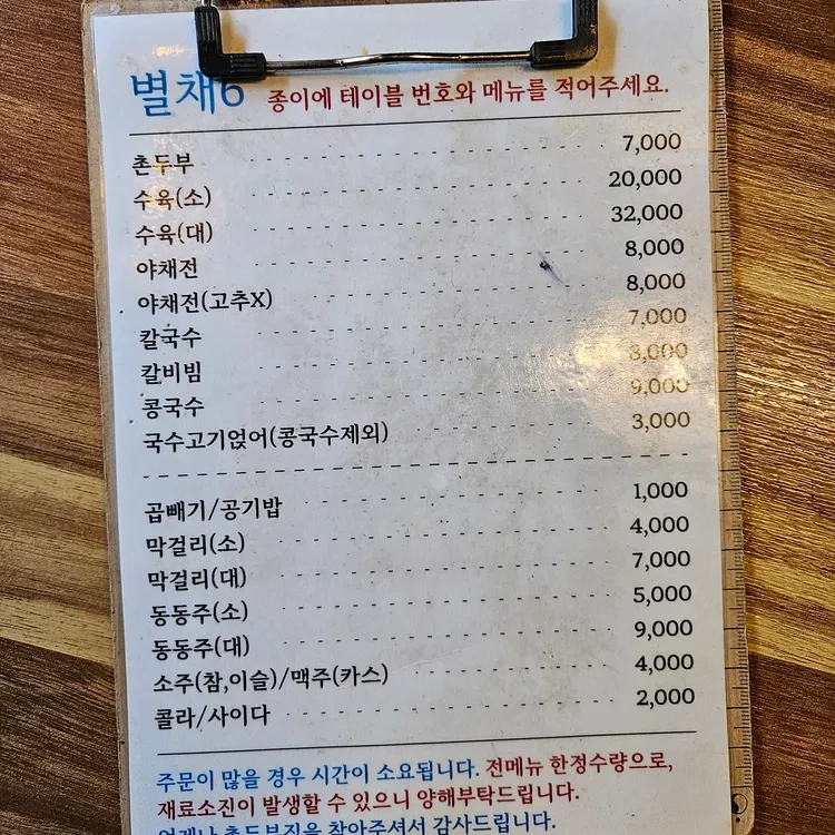 이곳의 메뉴는 정말 다양해요. 가장 인기 있는 메뉴는 촌두부로, 가격은 7,000원이랍니다. 그리고 수육은 소량과 대량으로 나뉘어져 있어, 각각 20,000원과 32,000원이에요. 또, 야채전도 추천하는 메뉴 중 하나로, 가격은 8,000원이죠. 칼국수는 7,000원, 갈비비는 3,000원, 콩국수는 9,000원이에요. 메뉴판을 보면 가격이 정말 합리적이라는 생각이 들어요.