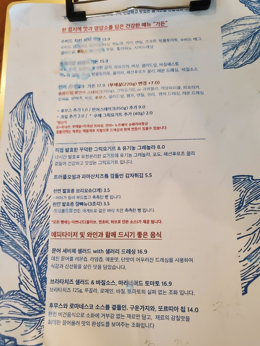 르가든블루의 메뉴는 정말 다양해요. 특히 추천하고 싶은 메뉴는 트러플 향이 가득한 뇨끼와 신선한 해산물 요리입니다. 가격대는 대체로 합리적이며, 예를 들어 연어 스테이크는 18,500원으로 제공돼요.