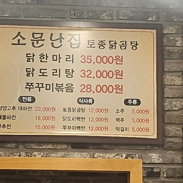 소문난집의 메뉴는 다양하고 가격도 합리적이에요. 대표적인 메뉴로는 "닭 한 마리"가 있는데, 가격은 35,000원이랍니다. 이 외에도 "닭 도리탕"은 32,000원, "쭈꾸미볶음"은 28,000원이에요. 가격대가 부담스럽지 않아서 친구들과 함께 가기에도 좋죠.